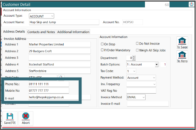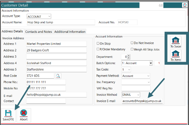 • “Invoice Email” is the section where you can add in the email address of where the customer would like their invoices sending to. If this field is left blank, then the invoice will be sent to the customer contact email on the left. Once you have populated all the customer details, you have the option to send the customer details through to your financing system. Then Click on the “Save” button.