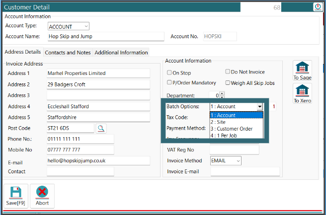 • “Batch Options” is how the customer wants the invoice sending. For Account customers this is usually left as “Account”.