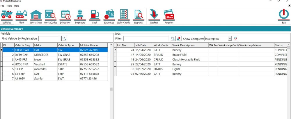 On the left part of the screen you have your list of vehicles and on the right of the screen you have the list of jobs associated with each vehicle.