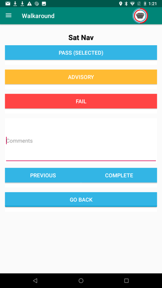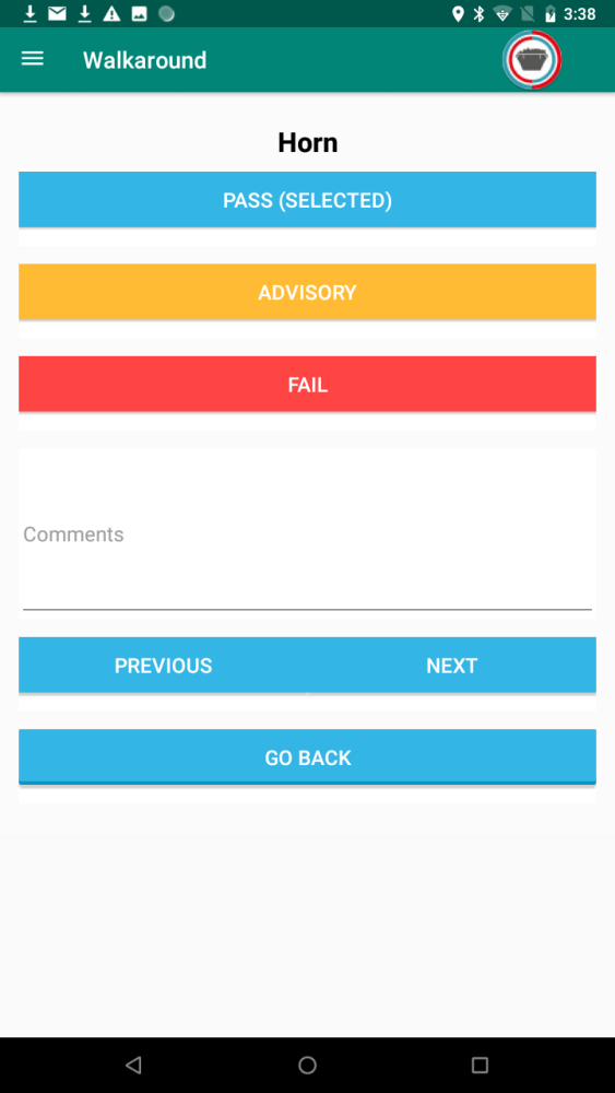 This opens up the actual check list, now click Pass, Advisory or Fail as required, the selected button turns blue when it is pressed, you can also add comments if required, perhaps the driver had a bulb out failed the walkaround but changed a bulb himself to continue etc this can be noted in the comments box once the driver is ready to move to the next item click the Next button, you can go back but you can’t change any entries, this is part of the legal requirement.