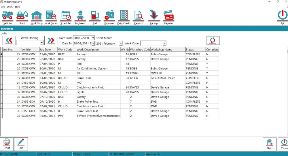 You can filter dates to and from, or specific job codes, the default view is weekly and it opens on the current week. Here we have listed all jobs from Feb 2020 to Feb 2021