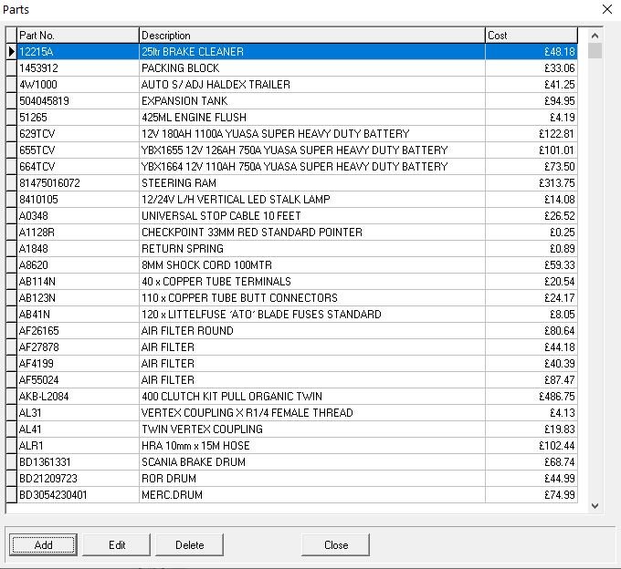 From here you can Add, Edit or Delete a Part