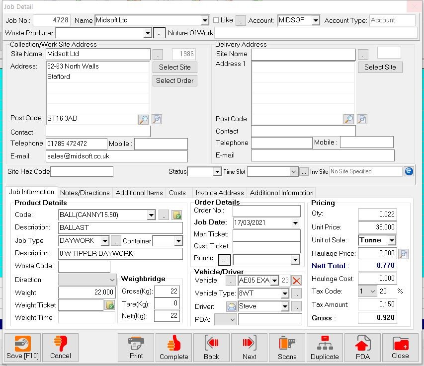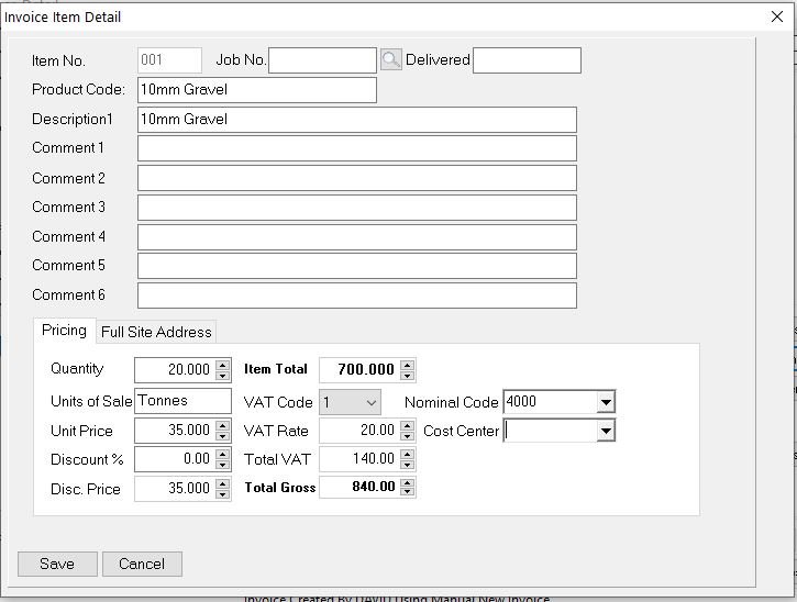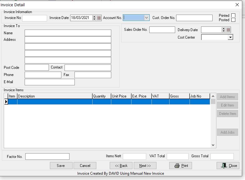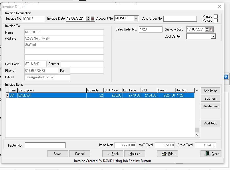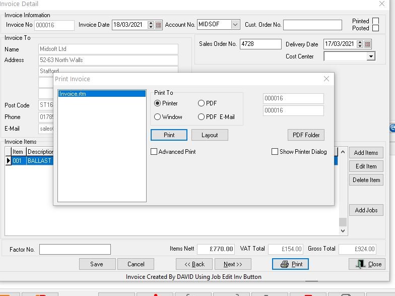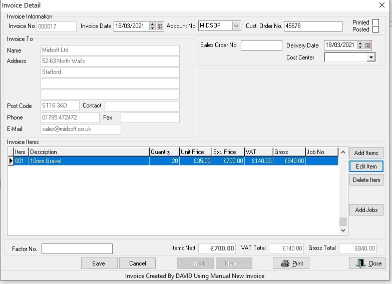 Click Save and then print or email the invoice or close if you want to batch print later