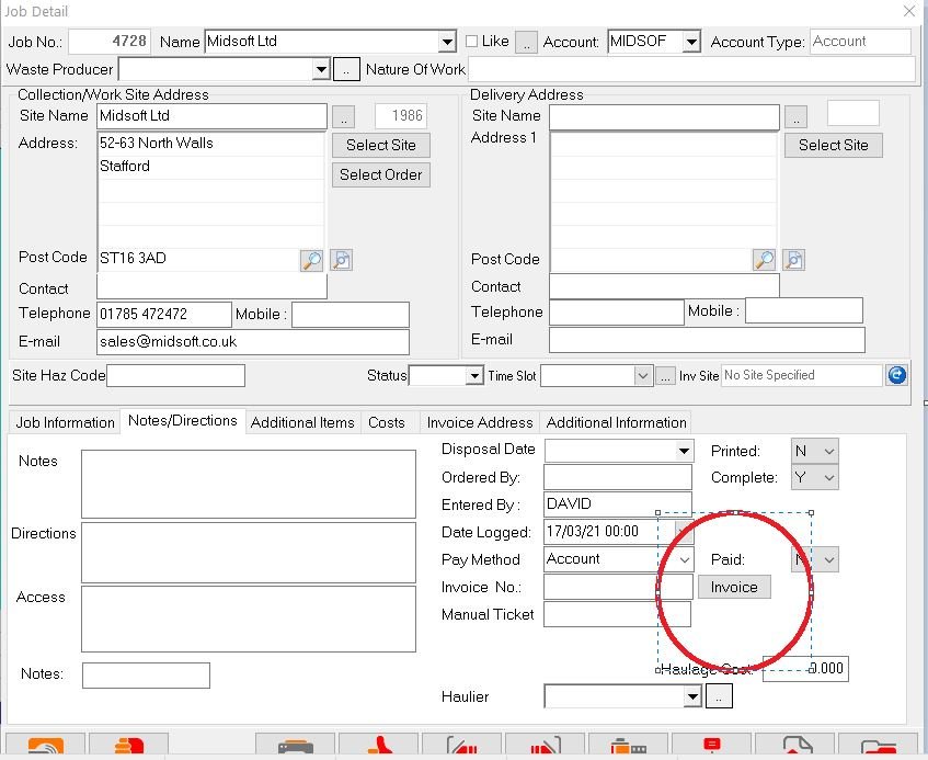 Then click the Invoice button on the Notes/Directions screen