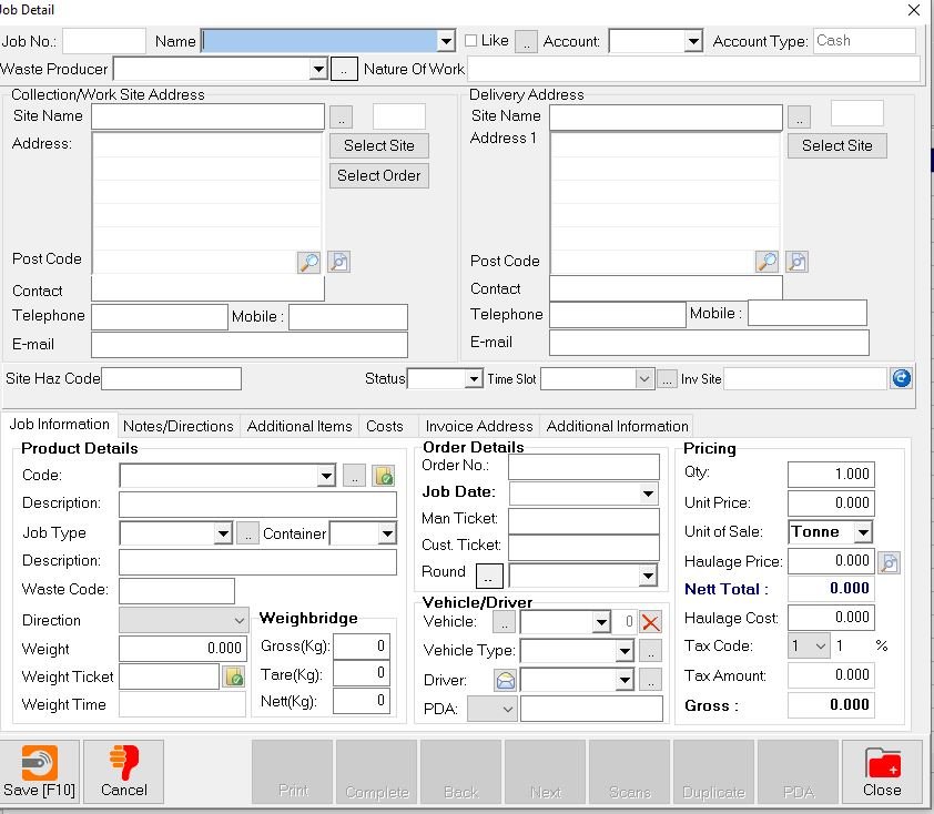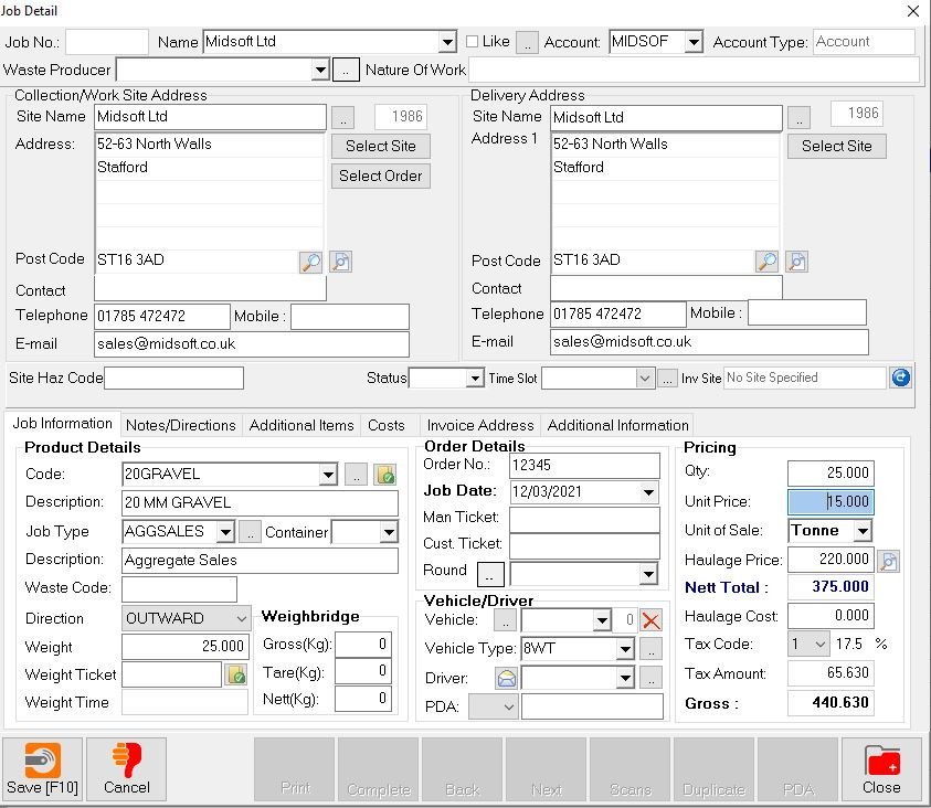 The default start place is the customer name, add that in and complete the job details, site for delivery, actual item they are buying, all the relevant costs and codes.