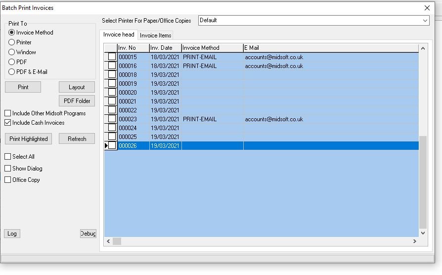 You can select how you print the invoices, the default is “Invoice Method” this is selected within the individual customer page, you can choose between hard copy for postage or email copy, when you click print customers who require hard copies will be sent to the printer and customers who want emailed copies will be sent an email, email customers get any related POD’s, weighbridge tickets and photos attached to the email also.