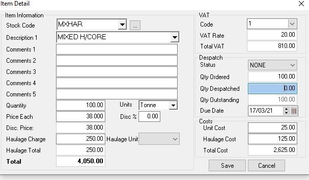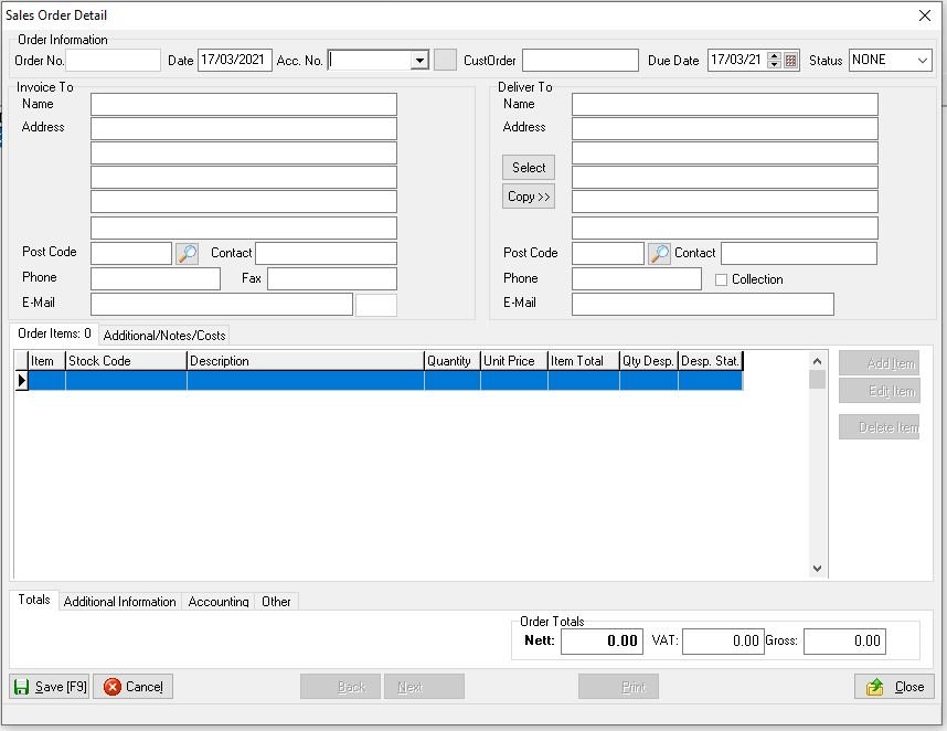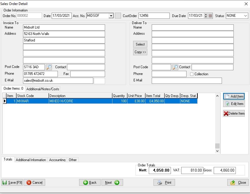 Click Save and the order screen is populated, if required add extra items or print the order in hard copy or to email for sending to the customer as an acknowledgement when finished click Close.
