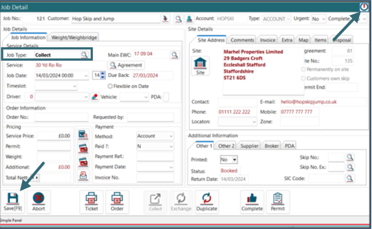 • You will then be displayed with the “Job Details” page and you will see that the job type has now changed to Collect. Here you can also look to update the job details allocating a driver if required. If you are happy with the job details click on the “Save” button and then click the close window button.