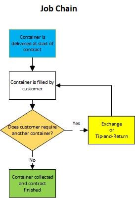 The length of the chain will depend on the customer’s requirement, but will always start with a ‘Delivery’ and end with a ‘Collection’. In between these two emdpoints will be any number (from 0 upwards) of ‘Exchange’ or ‘Tip-and-Return’ events (see flow diagram below).