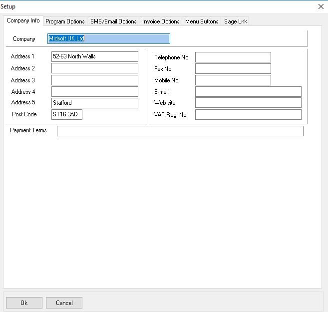 - On the initial installation of SkipTrak the Main setup Screen will open for your company information.